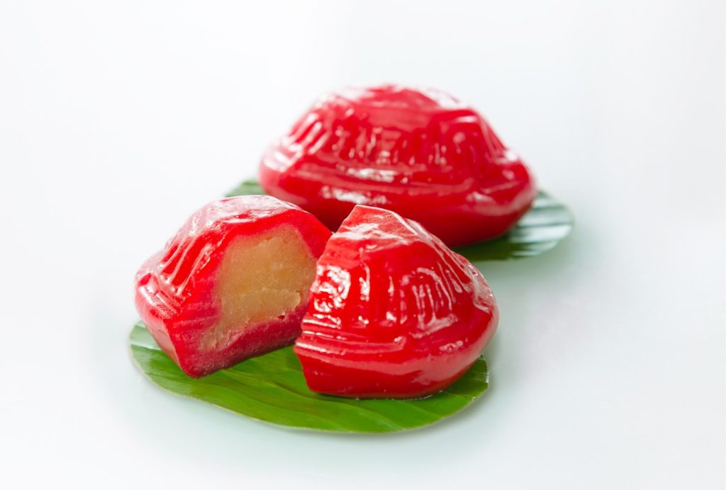 Setelah mencetak adonan dengan cetakan bermotif kura-kura, mereka meletakkannya di atas daun pisang agar aromanya lebih wangi. Warna merah yang mencolok melambangkan kebahagiaan, keberuntungan, dan kemakmuran, sebab itu banyak orang menyajikannya saat perayaan Tahun Baru Imlek.
